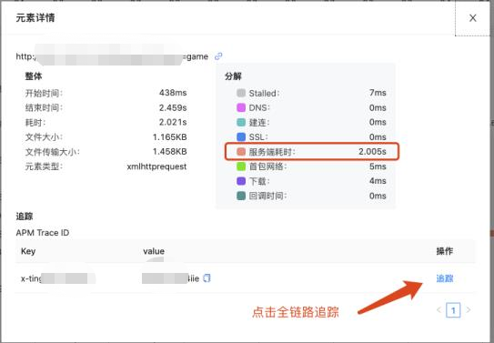 如果確認為服務(wù)端響應(yīng)慢,還可以進行深入的全鏈路追蹤到服務(wù)端,查看調(diào)用鏈路。系統(tǒng)會自動判斷疑似問題。