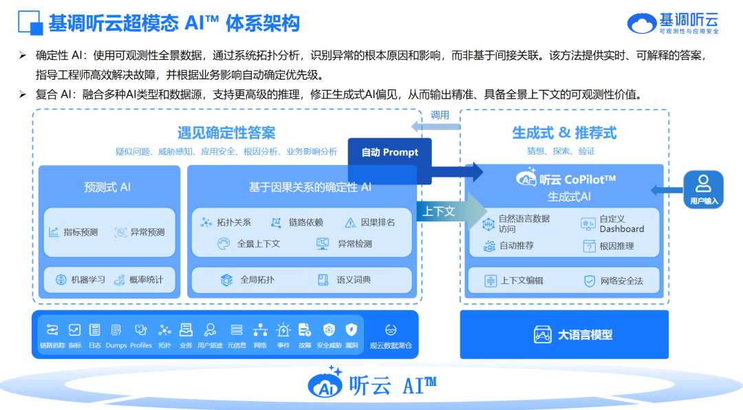 在大模型浪潮席卷各行業(yè)的當(dāng)下,基調(diào)聽(tīng)云將AI能力深度內(nèi)嵌于可觀測(cè)性平臺(tái),構(gòu)建“Copilot+可觀測(cè)性”的統(tǒng)一智能運(yùn)維體系: