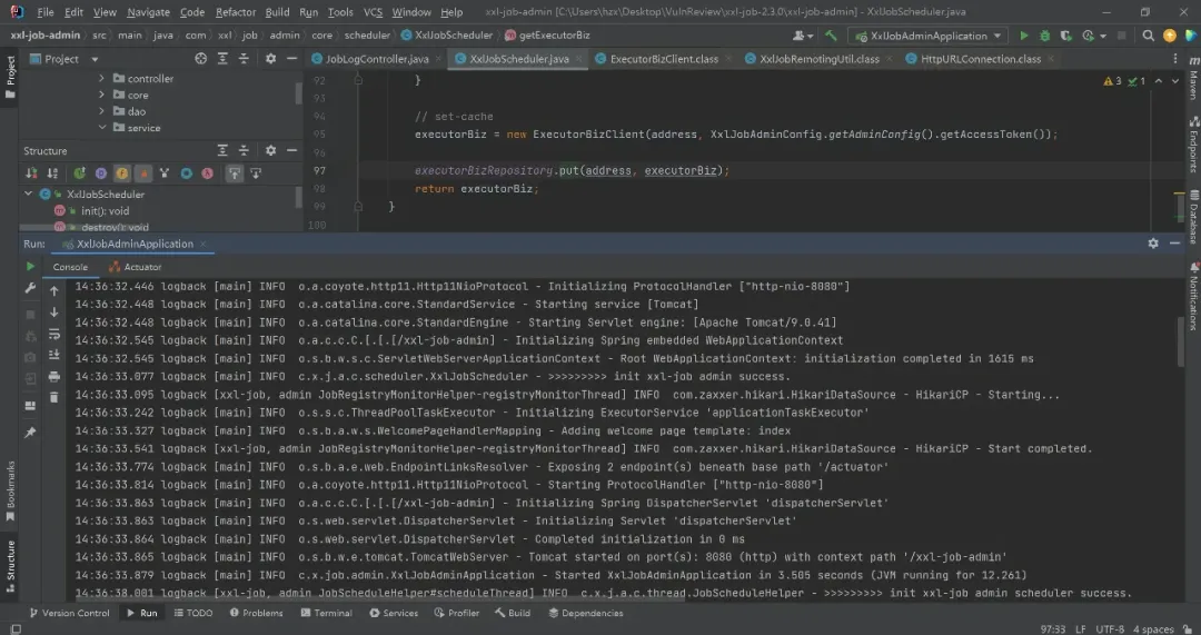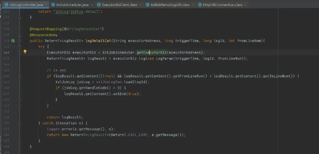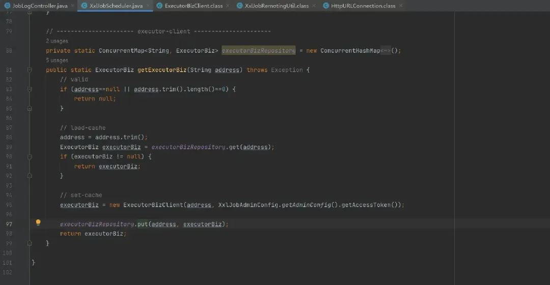 通過(guò)觀察 XxlJobScheduler.java,發(fā)現(xiàn)傳入的 executorAddress 沒有經(jīng)過(guò)特別的安全校驗(yàn),返回了接口類 executorBiz。