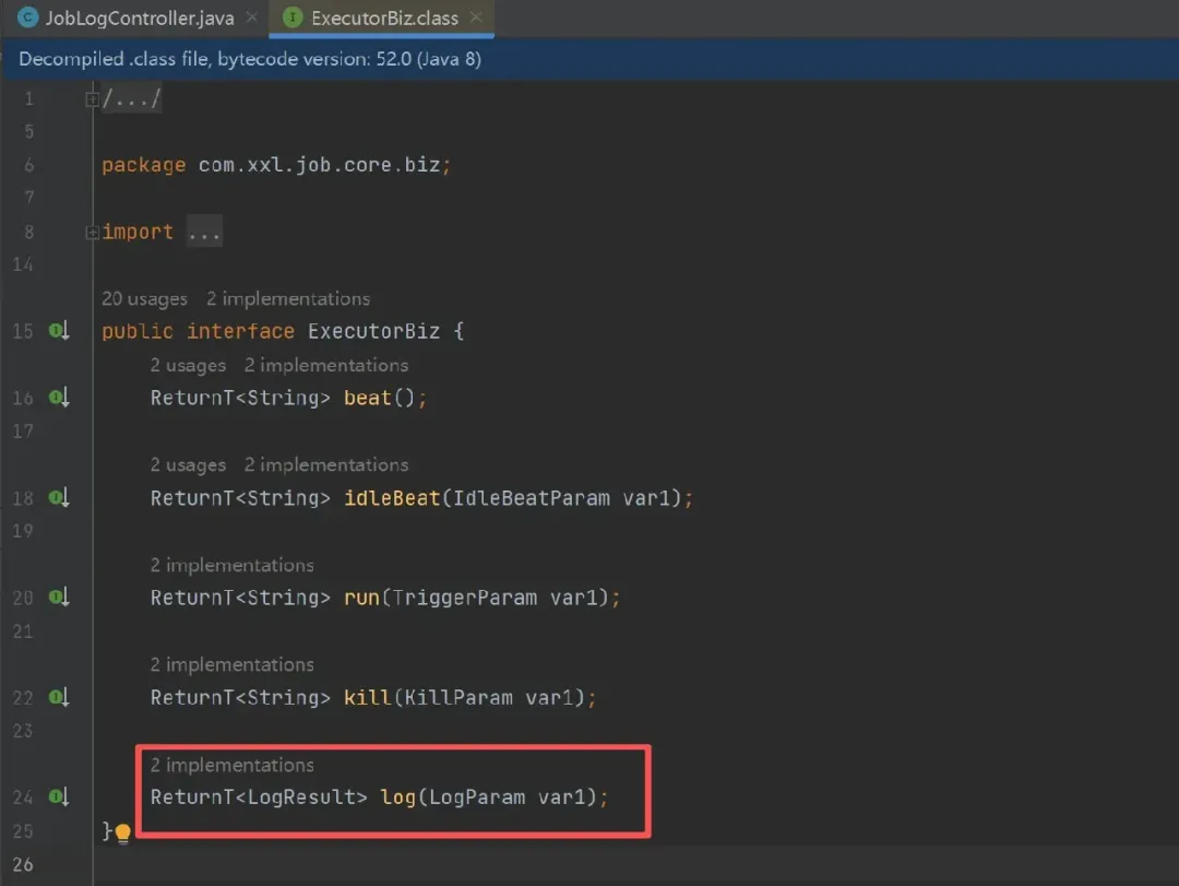 接口類 executorBiz 中定義了遠(yuǎn)程執(zhí)行器應(yīng)該具備的功能(心跳、觸發(fā)任務(wù)、kill、日志等)。其中日志功能有兩個(gè)實(shí)現(xiàn)類,其中 ExecutorBizClinent 下面會(huì)提到的。