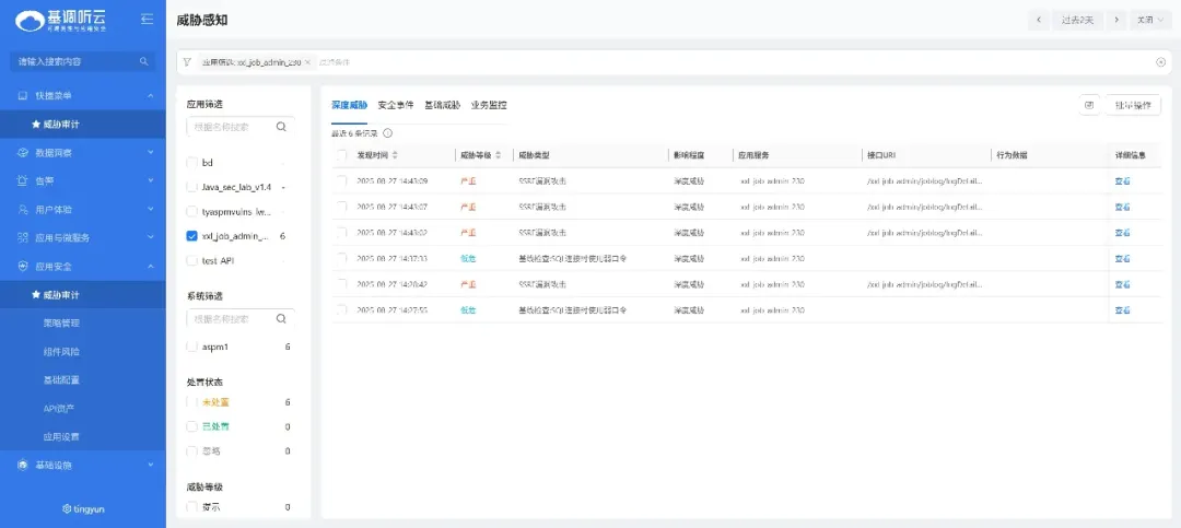 面對(duì)日益復(fù)雜的網(wǎng)絡(luò)安全威脅,專業(yè)的應(yīng)用安全性能管理(ASPM)工具顯得尤為重要。聽云 ASPM 用戶可以通過(guò)威脅感知,組件風(fēng)險(xiǎn),來(lái)實(shí)時(shí)觀察自己的系統(tǒng)是否存在依賴 0day 安全風(fēng)險(xiǎn)以及 1day 或 nday 的組件風(fēng)險(xiǎn)。針對(duì)上述 xxl-job 漏洞,聽云 ASPM 能夠發(fā)揮以下關(guān)鍵作用: