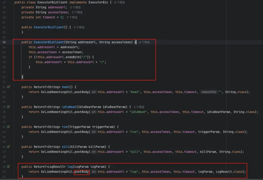 我們找到 executorBiz 的實(shí)現(xiàn)類 ExecutorBizeClient,調(diào)用 log 函數(shù)前的初始化步驟,會(huì)通過(guò)構(gòu)造函數(shù)在每一個(gè) addresssUrl 后面加一個(gè)“/”,然后返回 XxlJobRemotingUtil.postBody 的調(diào)用結(jié)果,還會(huì)在初始化后的 addressUrl 拼接“l(fā)og”,所以實(shí)際調(diào)用的 addressUrl 應(yīng)該是http://{addressUrl}/log。