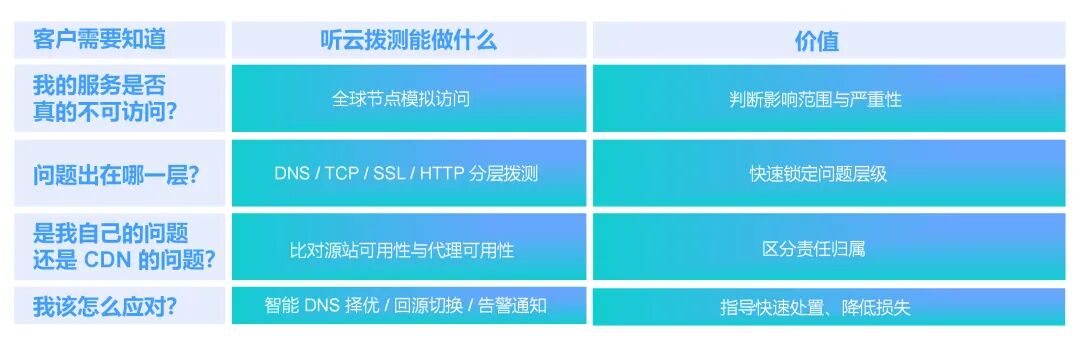 撥測不是替廠商“抓錯(cuò)”,而是替客戶“還原事實(shí)”,當(dāng) CDN 或云服務(wù)宕機(jī)時(shí),聽云 Network 的撥測體系可以幫企業(yè)在幾分鐘內(nèi)回答這四個(gè)關(guān)鍵問題: