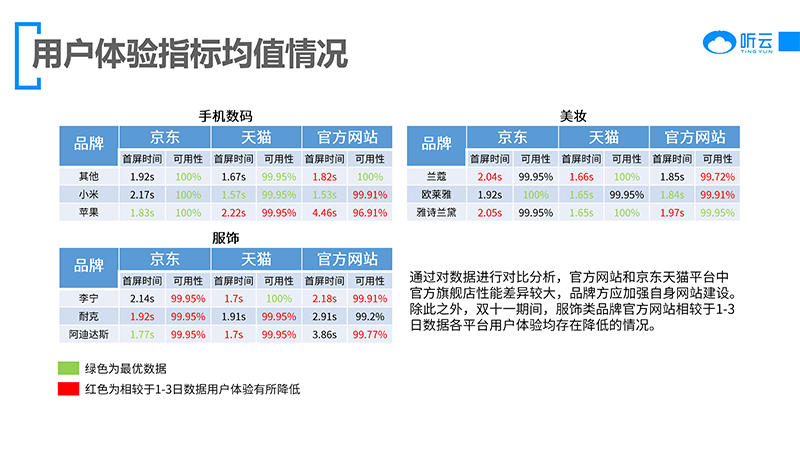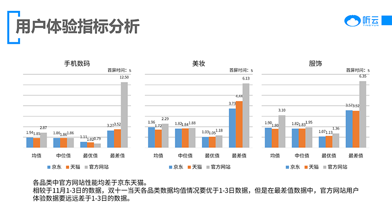 雙十一期間,各電商網(wǎng)站及各大服裝手機(jī)美妝品牌紛紛拿出誘人的折扣,在各電商平臺都能看到他們的影子,各品牌在不同電商平臺及自身網(wǎng)站用戶體驗(yàn)如何,通過聽云Network真實(shí)用戶節(jié)點(diǎn),對各品牌官方網(wǎng)站和京東天貓官方旗艦店用戶體驗(yàn)數(shù)據(jù)進(jìn)行對比分析,來看一看各網(wǎng)站用戶體驗(yàn)情況。