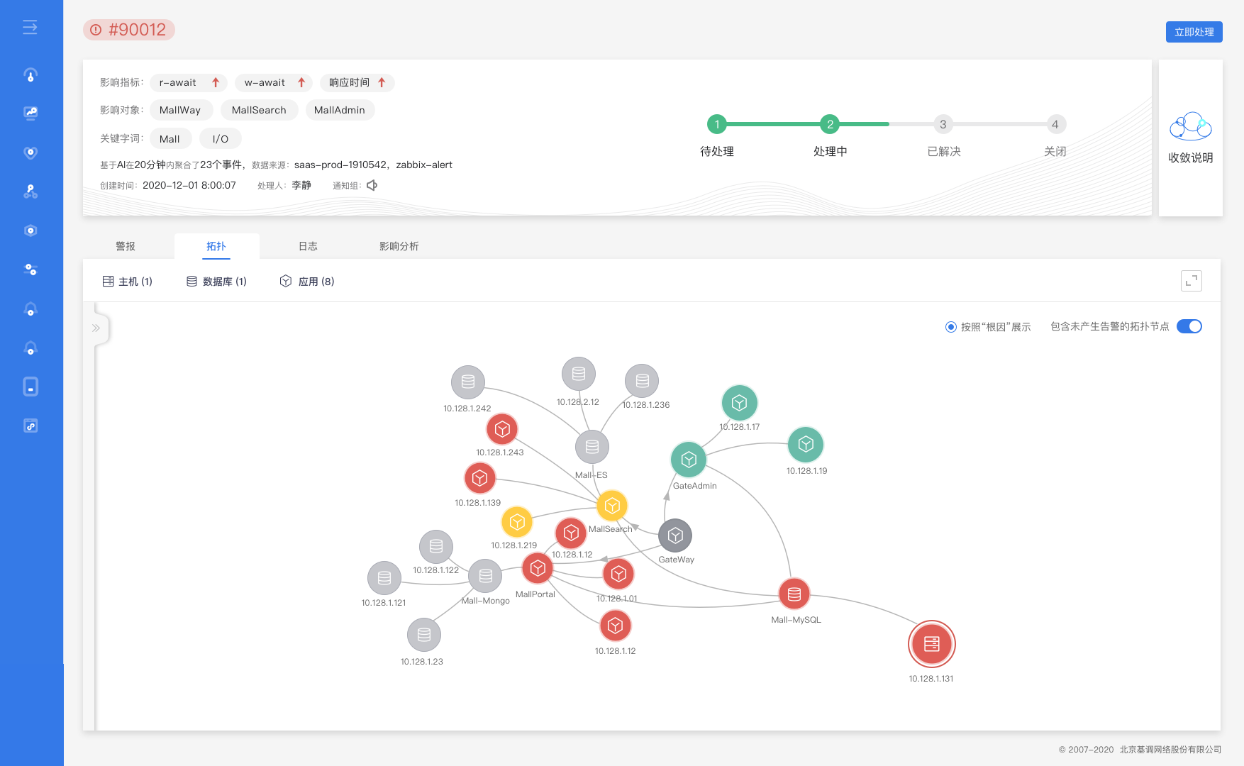 在當(dāng)今虛擬化和高度冗余的IT環(huán)境中,如何快速確定故障發(fā)生原因?基調(diào)聽(tīng)云北冥告警平臺(tái)致力于調(diào)查影響業(yè)務(wù)服務(wù)的根本原因,利用機(jī)器學(xué)習(xí)技術(shù)對(duì)大數(shù)據(jù)提供的上下文信息進(jìn)行分析,了解事件的相關(guān)性、依賴關(guān)系和因果關(guān)系等相關(guān)性特征,推斷出可能的根本原因;還可根據(jù)用戶的反饋提升根因分析算法的準(zhǔn)確度,提高運(yùn)維解決效率,降低服務(wù)中斷的影響。
