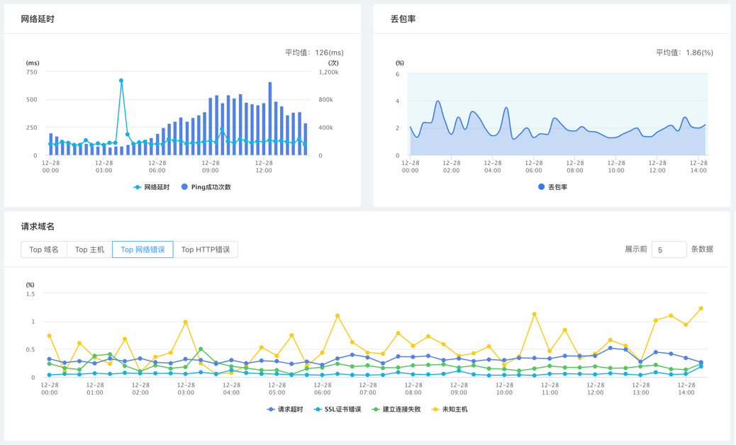 通過(guò)探測(cè)應(yīng)用使用過(guò)程中的網(wǎng)絡(luò)波動(dòng),提供網(wǎng)絡(luò)延時(shí)和丟包率兩大核心指標(biāo),讓運(yùn)維人員能夠區(qū)分判別客戶(hù)端網(wǎng)絡(luò)環(huán)境較差導(dǎo)致的網(wǎng)絡(luò)錯(cuò)誤。